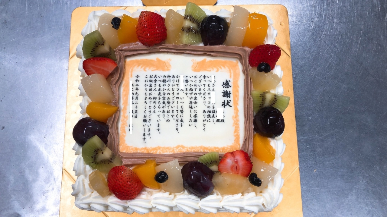 大切な記念日やサプライズに賞状型のケーキはいかがですか!みんなでお祝いをした後は、美味しく召し上がれます。 お客様が考えた文章をそのまま賞状風にプリントして仕上げます。土台のケーキは、エミリー自慢のしっとりスポンジに北海道生クリームとイチゴをサンドしてあります。見た目だけでなく味もにもこだわりを持って作っています。